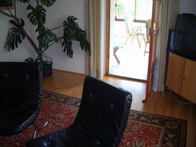 Das Wohnszimmer schließt sich an den Wintergarten an und stellt für alle, die auch im Urlaub nicht auf den Flimmer-Kasten verzichten wollen, eine Satelliten–TV–Anlage zur Verfügung.